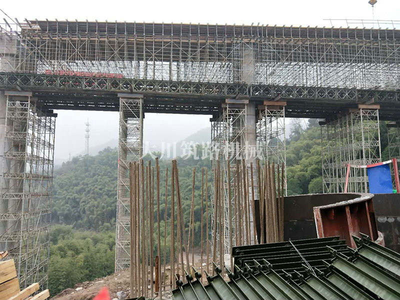 特點(diǎn):現(xiàn)澆梁支架平臺(tái)的跨度大,高度高,使用的貝雷片數(shù)量達(dá)到1808片,加強(qiáng)弦桿2800根,工程于2017年9月開始施工。